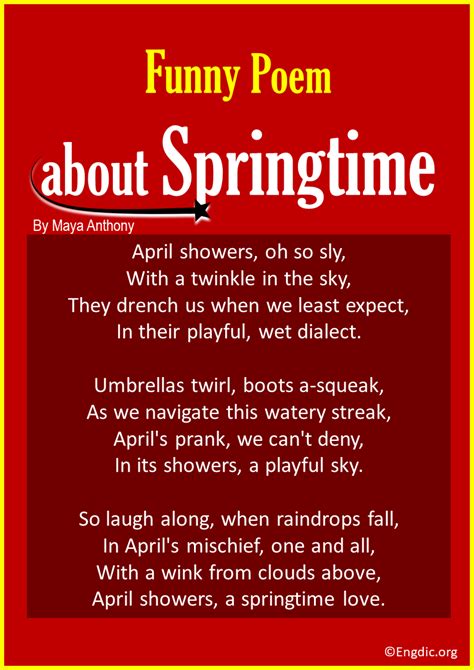 Funny Spring Poems. Web read, share, and enjoy these hilarious spring funny poems about springtime, nature, animals, and more. These spring humorous poems are examples of humorous poems about spring.