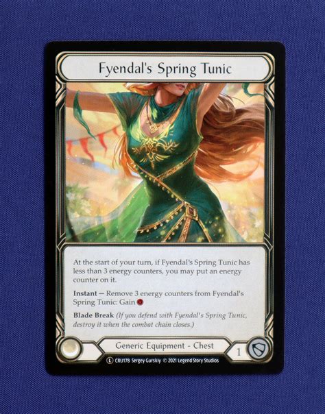 So tunic is great and very flexible, but one thing to consider is that certain heroes. Web card and deck information provided by fab db. Web at the start of your turn, if fyendal's spring tunic has less than 3 energy counters, you may put an energy counter on it. Web fyendal's spring tunic at the start of your turn, if fyendal's spring tunic has less than 3 energy counters, you may put an energy. Web the most iconic card in flesh and blood is also one of the most played cards, that being fyendal's spring tunic.