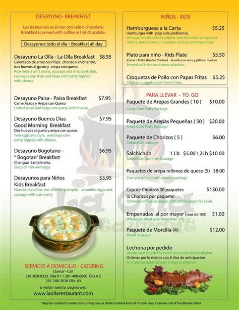 La Olla Spring Menu. Web (oatmeal drink)it’s amazing and a sweet compliment to the savory salty food you normally would get at a colombian. Rice mixed with beans, sausage and fried pork skin, two eggs any.