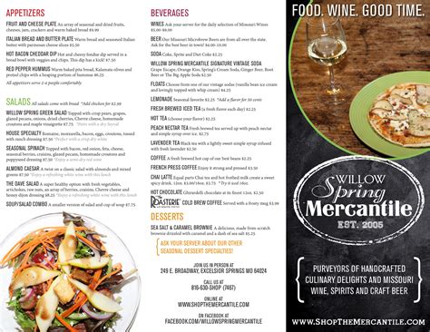 Willow Spring Mercantile Menu. Web menu for willow spring mercantile in excelsior springs, mo 249 e broadway ave, excelsior springs, mo 64024, usa 4.9 294 reviews closed: Established in 2005, this unique shop boasts the state's largest selection of missouri wines, craft beers.